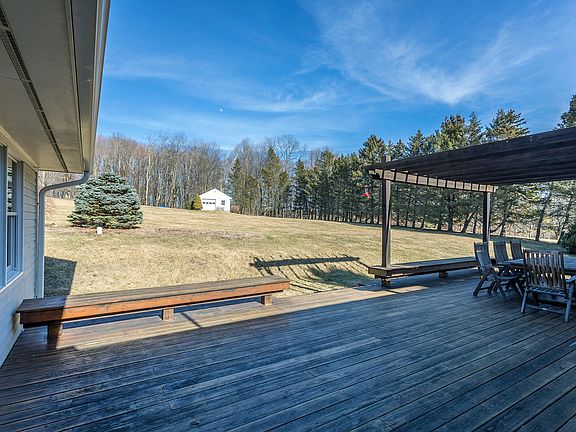 Gorgeous one level home on 4+ acres of open land with sunrise and sunsets facing west. A small apple orchard and open pastureland add to the feeling your own private estate! Just minutes from Roxbury Center, great restaurants in Woodbury and Washington, this home has been lovingly updated throughout. The living room with stone fireplace, hardwood floors and picture window overlooks the western sunset view. A spacious great room with fireplace and slider, opens on to a large deck with pergola for easy entertaining! There are 4 bedrooms with 2 ensuite. An open floor plan offers a great room with vaulted ceiling which opens on to the high end kitchen complete with center island and breakfast bar. A formal dining room, mudroom, grand master bedroom with vaulted ceiling with updated master bath all add to the ease of one level living. Other amenities: outbuilding one bay storage for car, planting shed, full basement, attached 2 bay garage, covered front porch.