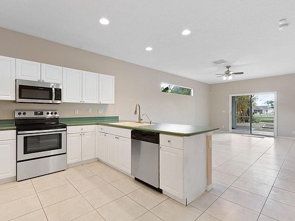 Incredible opportunity to own a CBS, 3 bedroom, 2 bath, 1-car garage home w/ huge fenced-in yard & water views! Huge kitchen w/ breakfast bar overlooking family room. Perfect location - walk in seconds to Veterans Park! NO HOA! Bring your truck, boat, pets...all welcome! Nicely updated with BRAND NEW carpet, BRAND NEW complete interior paint & BRAND NEW stainless appliances. Hurricane shutters included. Screened patio perfect for entertaining. This is the one!