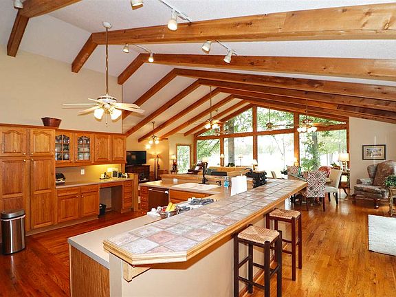 This prime piece of property contains 566' of seawall water frontage! Complete w/ a 20'x20' pavilion w/ outdoor kitchen area, 14'x14' gazebo, boathouse with lift, dock & outdoor deck! Fridge & washer/dryer stay. Vaulted ceilings, open concept house plan, gas range, upgraded cabinets, tile top brkfast bar, Buck Stove, Master on main floor, walk-in closets, Master Suite has jetted tub, marble tile shower, marble tile floors, dbl vanity. Walk-out basement includes rec room w/ tile floor, bedroom w/ ensuite bathroom. Newly remodeled bathrooms, insulated windows, 12'x16' Bonus area upstairs, no HOA, County taxes only, 1-yr old water heaters, roof 7-yrs old, one of the HVAC units is 2 yrs old, gutters, mature hardwoods, gorgeous sunsets every evening, beautiful landscape, full 1.62-acre sprinkler system. House lot is fee simple. Point is leased. Must see to appreciate!