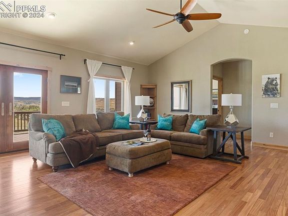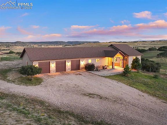 This enchanting country home, only 5 minutes from downtown Castle Rock, blends modern comfort with natural beauty. The wonderful ranch-style home features two main-floor bedrooms and an office, set within nearly 13 acres offering views of Pikes Peak. Inside, Brazilian teak floors and a vaulted ceiling complement a two-sided fireplace. Three sets of French doors in the great room open to a covered patio with a vaulted ceiling and Trex deck. The deluxe kitchen features Jenn-Air appliances, cherry cabinetry, and granite counters. Each bedroom has an ensuite, with a spacious primary suite opening to the deck. The lower level features a home theater and roomy rec room with a full kitchen/wet bar with a fridge, oven, and stove. The barn is truly stunning with 5 wood-fenced stalls with runouts, a large tack room, and a concrete aisle with 10-foot overhead doors at each end. The metal, 1,500 square foot equipment barn, built in 2017, features both a 12-foot and 10-foot overhead door while the attached 3-car garage is extra deep with a drive-through. Here is everything you are looking for in a county home!
