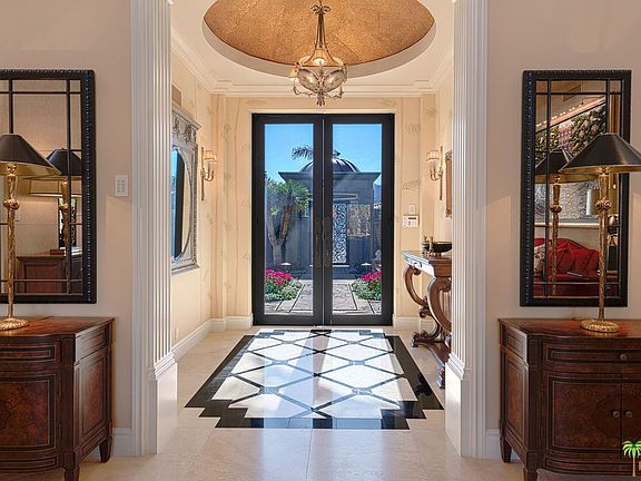 Stylish waterfront living awaits at this impressive, updated 3 bed/3.5 bath/4,571 SF home in the guard-gated community of Waterford. A double-door entrance leads to a grand foyer which opens to an extraordinary entertainer's living room complete with a soaring back-lighted dome ceiling, fireplace, and sunken bar with ScotsmanTM ice-maker. Culinary enthusiasts will delight in the well-designed kitchen equipped with confidence inspiring brands of ThermadorTM and Sub-ZeroTM. 2 islands provide generous prep and serving surfaces and flow to adjoining breakfast area. Double doors lead to outdoor dining and spacious terrace overlooking the private lake. The interior features dual masters and a third guest room all en suite. Enjoy entertainment on an enhanced scale in the media room, equipped with blackout motorized shade, massive screen as well as premium surround sound. A formal dining room flanks the main living area, providing a traditional and intimate setting for hosting celebrations.