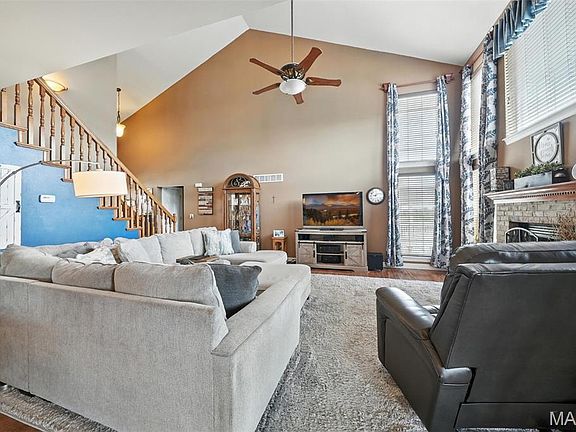 Welcome to this spacious story-and-a-half home, ideally situated near Gravois Bluffs with easy access to I-44 and I-270. Enter through an expansive foyer that flows into a bright, open-concept family room, dining area, and kitchen, all featuring hardwood floors and dramatic two-story vaulted ceilings. The kitchen features upgraded cabinets, a center island, double ovens, and a large pantry. Enjoy peaceful views from the screened-in deck off the dining room—ideal for morning coffee and an evening of winding down. The main floor includes a home office with French doors, a laundry room with storage, and a large primary suite with a spacious walk-in closet, complete with a soaking tub, separate shower, and double-bowl sinks. Upstairs, a versatile loft overlooks the family room, leading to two generously sized bedrooms and a full bathroom.
