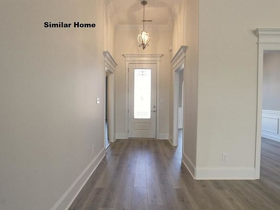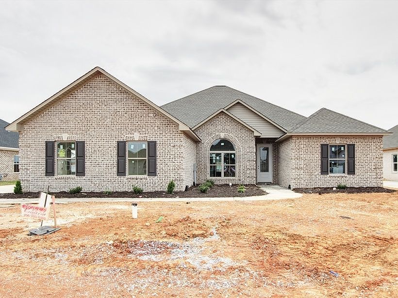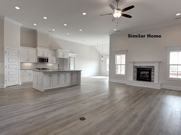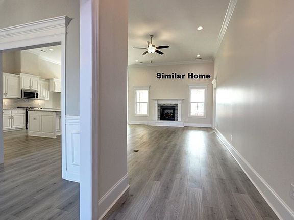All brick Mayfield Plan A is an open plan with a 3 car side entry garage backed by a 2-10 home warranty.. Home has 4 bedrooms, 3 baths. Home has wood plus flooring (Mohawk Revwood) in all living areas and bedrooms. Great Room features 12' ceiling, extensive trim, gas-log fireplace with upgraded fireplace treatment, wood plus flooring, floor outlet, recessed lights and ceiling fan. Dining room has 10' coffered ceiling, wood plus flooring, extensive trim including shadow box under chair rail. Kitchen includes 12' ceiling, custom cabinetry and granite countertops, large island with extra storage and countertop seating, stainless appliances including dishwasher, gas range and microwave, tile backsplash, wood plus flooring, recessed lighting, and walk-in pantry. Breakfast has 12' ceiling, wood plus flooring and extensive trim. Laundry has 9' ceiling, custom cabinet and tile flooring. Master bedroom has 11' double tray ceiling, recessed lighting, extensive trim and ceiling fan. Master bath has 11' ceilings, glamour tub, large tile shower with rimless shower door, separate toilet area, double vanity with granite counter tops and large walk-in closet. The additional bedrooms have 9' ceilings, wood plus flooring, ceiling fans and crown molding. The additional baths have tile flooring and granite counter tops. Home has rear covered porch with ceiling fan. The home has a tankless water heater. Home includes fully sodded yard, gutters including piping under sidewalks and attractive lands