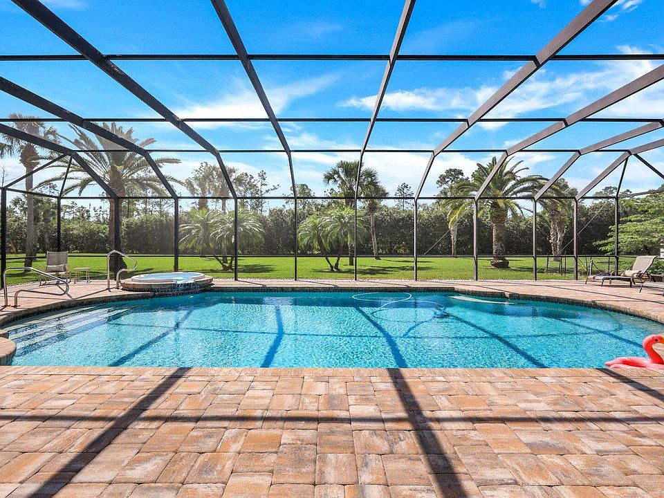 The homes open floor plan features large windows that flood the space with natural light highlighting the spacious layout. The Chefs kitchen with double oven, cook top and plenty of counter space and cabinet storage .. 3 well appointed bedrooms and 3 full bathrooms plus a dedicated pool bath off the lanai. Take a dip into the sparkling pool or unwind in the hot tub all while enjoying the Florida Sun. The 3 acrea are a gardeners paradise with a variety of trees from various palm trees to Banana, Mango, lemon, avocado, jamaican cherry and more! The estate is a rare find, offering both the peace of country living and convenience of easy access to shopping & dining.