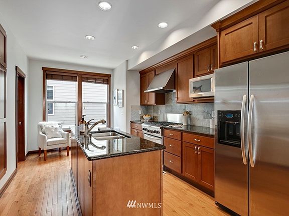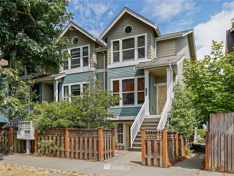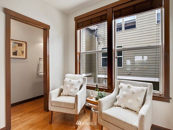 Refined Craftsman Townhome on Capitol Hill. The airy open concept main level features wood floors that flow into the kitchen w/ a large island, pullout pantry, & deluxe gas range, plus a seating nook. Living room features AC for the summer & cozy gas fireplace for the winter. Treetop primary suite features territorial & City of Bellevue views, a cozy window seat, a built-in storage wall, dual closets, crisp AC, & an ensuite bath. Across the hall is a spacious 2nd bedroom w/ a soaring ceiling & ensuite bath. Lower level is a private escape w/ another ensuite bath & patio access- perfect retreat for you or your guests. Don't miss: new carpet, newer W&D, garage, & guest powder room Walk to restaurants, groceries, shopping transit, & more!