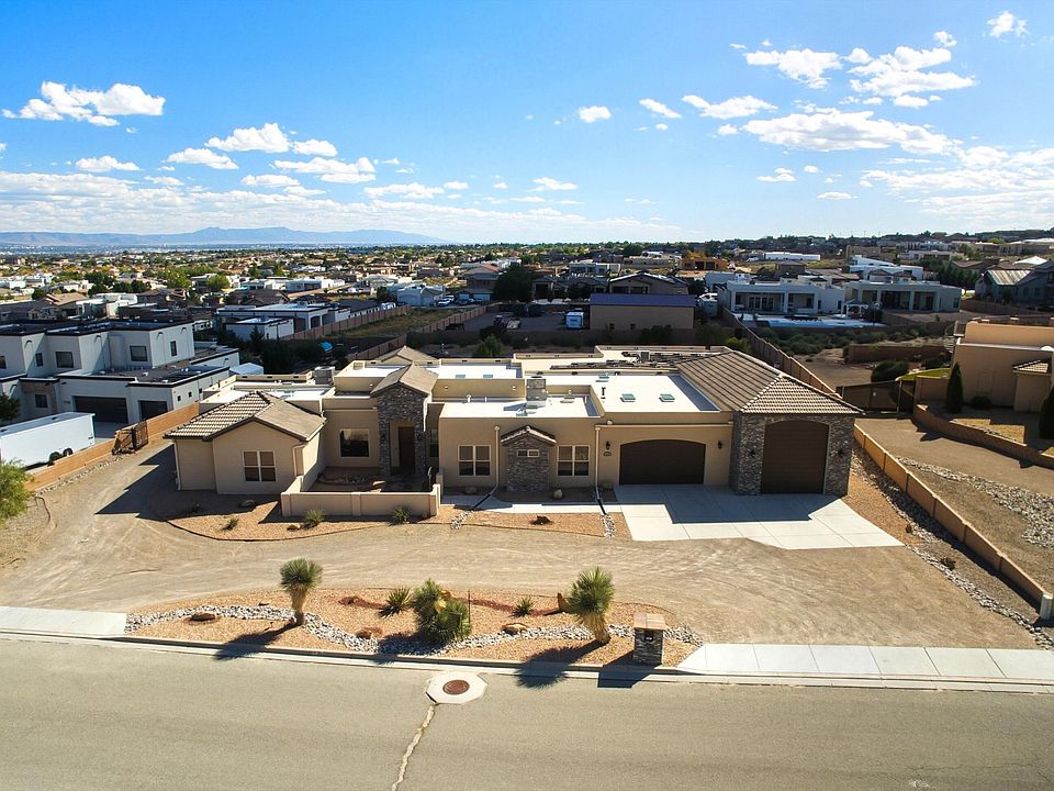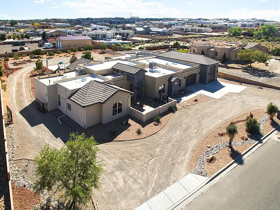 Extraordinary custom luxury estate situated on a private 1-acre double lot in the highly sought-after Montebella Estates Community, Massive Garage! up to 10 cars**located on the Albuquerque border with quick access to shopping, dining, and major conveniences. Built in 2017 with superior 2x6 construction, this meticulously designed home offers an exceptional floor plan featuring 5 bedrooms, office, formal dining room, open game room with bar, and a dedicated home theater. Soaring ceilings up to 15 feet, multiple skylights, and abundant windows provide incredible natural light throughout. The gourmet kitchen is beautifully appointed with granite countertops, custom soft-close cabinetry, pull-outs, decorative tile backsplash, coffee Bar, recessed LED lighting and SS steel appliances