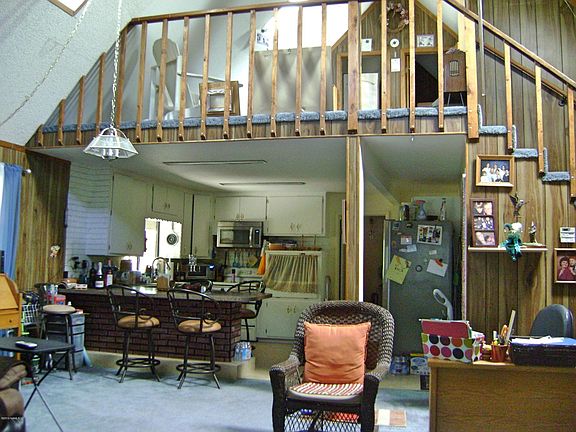 This Winter livable 3 BR, 1.5 Bath Home is an Open Plan allowing entertaining friends while you cook. Plentiful counter space and cabinets. There is a space in which owner keeps her freezer but it could be made back into a pantry by adding a door. Counter has space for 4 stools. Brand new Rheem hot water heater. LR has a large Bay Window; also 3 skylights; sm doggie door; Huge Upper Windows. Off the Kitchen is a beautiful tiled walk-in shower. Bath & Kitchen tiled. Off the bath is the Master BR. Also off the kitchen is a ''Mud Room Laundry'' with W&D which convey and is entered from a covered deck . Upstairs has a Large Loft, two BR and a 1/2 BA and 2 Sky Lights. Central Propane Heat. The Roof is 8 years old all on a Well Treed lot with circular driveway; paver patio & Lg Storag