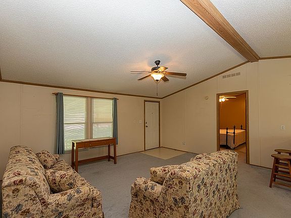 Almost ¾ Acres. This well-kept manufactured home has 4 bedrooms, all with walk-in closets. 2 full baths, 1 of the bedrooms can also be used as an office, and has access to side of home into a fenced area. (Great for pets). Furniture is included. High vaulted ceilings, ceiling fans in every room. Walk-in closets in all bedrooms. Washer & Dryer included. Large deck. Covered porch with wheelchair accessibility. Electric Air Conditioning and propane for gas/heat. Covered carport holds at least 2 cars. Large shed for storage. Tornado/Storm Shelter. Partially fenced area. Treed, landscaped. Blinds and window coverings included. Kitchen Island great for prep work or extra seating. Fully sustainable with water, septic and propane.
