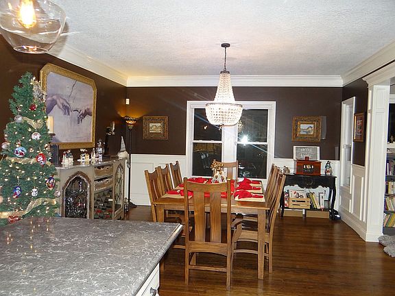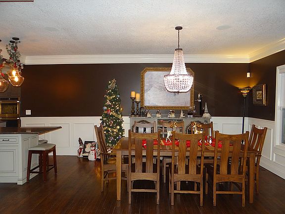 Dining room is open to the kitchen and hosts a beautiful chandelier with room for a very large table.