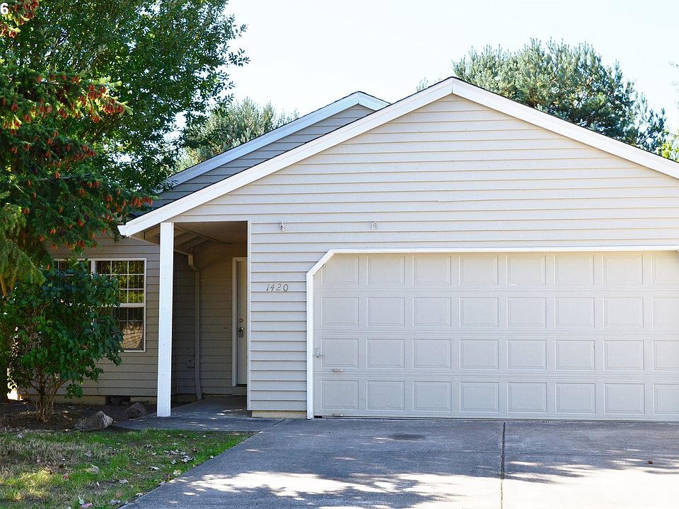 One level, 4 bedroom home with tons of appeal! New Carpet and vinyl throughout!New Paint inside & out! Kitchen has island with eating bar and a nice sized pantry! Family room is vaulted with gas fireplace and slider out to back deck. Master bedroom with walk-in closet, master bath has built in linen cabinet. Laundry closet with cabinets! Large fenced yard and a garden area. Fridge and blinds are included! Ready for move in!