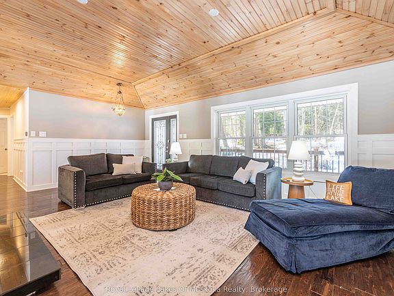 Exceptional offering, ideal 3.2 acres, 215' lakefront on pristine Pell Lake offering an Algonquin Park feel as you look across the lake towards the Limberlost Forest and Wildlife Reserve only minutes to Hidden Valley ski hill, golf courses and 15 minutes to vibrant downtown Huntsville. Pen Lake beach and boat ramp offering 40 miles of boating is less than 5 minutes away. Absolutely breathtaking views and such a serene setting with only 7 owners on the lake. This thoughtfully designed 1741 sq ft bungalow with full walk out finished lower level features 5 bedrooms and 3 full bathrooms and is nestled privately from the year round road. The main level boasts a gourmet style kitchen with huge center island, dining overlooking lake vistas, family size living room with vaulted pine ceilings and wood burning fireplace. Main level laundry. Primary bedroom boasts an ensuite and walk out double patio doors to the Muskoka room. 3 bedrooms main level and 2 in the lower. Lower level features great room for movie nights, games room including a foosball table, pool table, and electric fireplace. Adjacent room with bar, sink and fridge is great for entertaining or for additional guests. Main level large mud room/foyer could be good for an artist studio as well. Walk out on lakeside to decking with bbq and another access to the Muskoka room. Waterside firepit with all exterior furniture included. Dock was recently installed and has a deck/platform to enjoy sitting on the water and the fabulous island view! Lakefront is 3' deep at the end. Walk around covered deck from rear to front of the house. Large double car garage, air conditioning, new furnace October 2025, wired in generator, small barn style storage building and sheds for your firewood and outdoor tools and toys. Comes outfitted with furnishings, bedding, towels, boats on site, just a few staging items excluded. Equipped and ready for you to enjoy this summer! Airbnb ready if desired, ask for info and income.