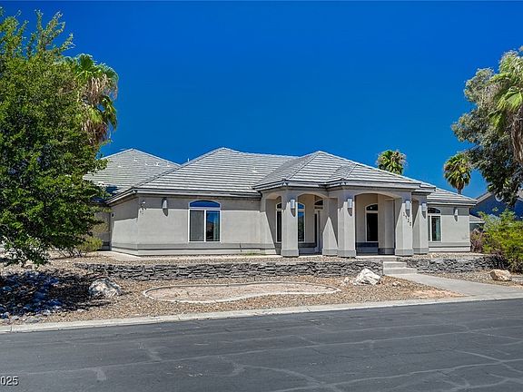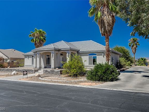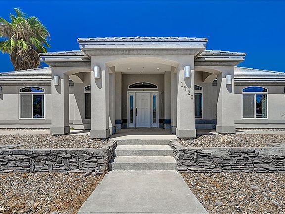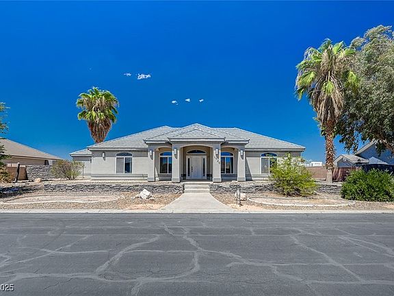 In the heart of Logandale, NV! Custom home with formal entry way, stained concrete, spacious rooms and ceiling fans. Step down into the living room with a bay window. Office with built in desk. Kitchen has breakfast bar, double ovens and recessed lighting. 2nd and 3rd bedroom have walk in closets. Primary bedroom on the main floor with a roomy walk in closet and good sized bathroom. Bedroom upstairs with a bathroom, balcony and den. 3 car garage!