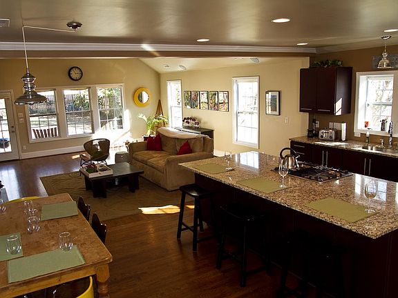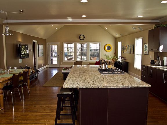 3 Bedroom/2 Full Baths -master suite, large open kitchen and combined living room which is great for entertaining, stainless steel Whirlpool energy-efficient appliances and custom cabinets. Kitchen has expansive granite countertops and the house has hardwood floors throughout. Enjoy a full, beautiful treed backyard with a stone fireplace. Hidden gem curb appeal.