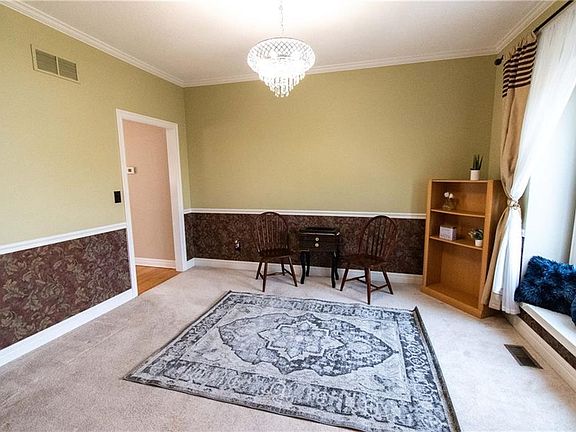 The kitchen connects to an eat-in dining area and living room, creating a functional layout for entertaining. The primary suite is spacious, including a walk-in closet, sitting area, and a jetted tub. The house also includes a full, unfinished basement, offering additional space for future customization.