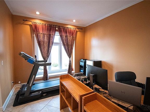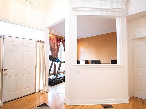 Welcome to this 2-story home featuring a main level with high vaulted ceilings and a skylight, bringing in plenty of natural light. The entrance leads to a large foyer with natural wood floors. Near the entryway, there is an open office space with large windows and tile flooring, and on the opposite side, a formal dining room.