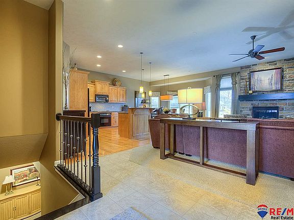 Don't miss this fabulous well maintained Elkhorn ranch home. All new light fixtures, custom window coverings, professionally decorated and landscaped. The house has a sprinkler system, security system and water softener. The full basement is unfinished with a bath rough in. The basement could easily be finished into a large family room and bedroom with an egress window. The kitchen features beautiful hardwood floors, maple cabinets and granite counters. Walk out from the kitchen dining area to a beautiful landscaped backyard and patio. Two bedrooms plus den on the main floor all have ceiling fans. Don't miss this gorgeous home!