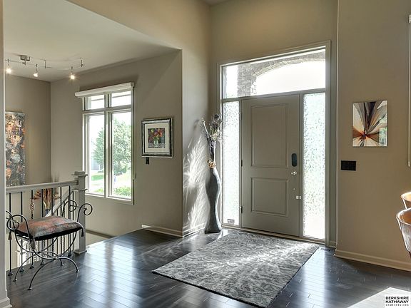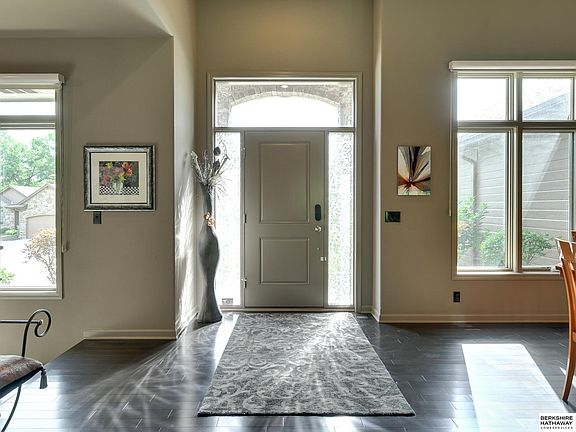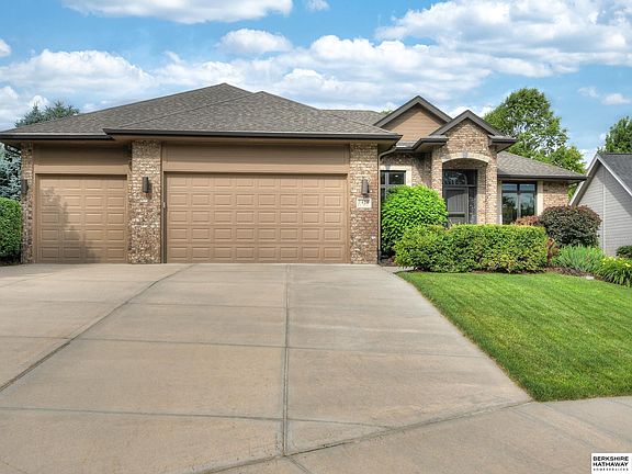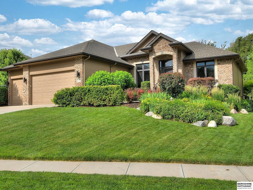 Situated on a gorgeous, private and serene setting in the heart of Elkhorn's West Dodge Station, you'll find this one-owner true custom ranch that is truly special. You'll love the warm decor and split-bedroom open floorplan. Enjoy 9' to 11' ceilings and engineered wood flooring, and formal dining room. The center island kitchen has gorgeous cabinets, gas cooktop, double ovens, pantry and a large eating area that leads to a covered deck for outside entertaining. The primary bedroom suite is oversized with double sinks, whirlpool tub, ceramic shower and spacious walk-in closet. The second bedroom, is currently used as an office which is perfect for work from home situations. Downstairs, you'll find two additional bedrooms, a 3/4 bath, as well as a dedicated home office. Don't wait to see this fine residence that's ready to enjoy.