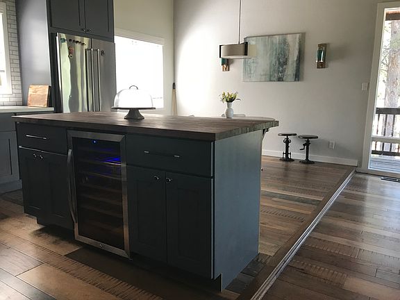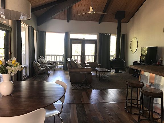 Open concept kitchen, dining and living room. This 4br/2ba home has 2 bedrooms and a bath on main level, a loft room with its own bathroom upstairs and a lower level bedroom. 24ft vaulted ceilings in the kitchen & living room. The vaulted ceilings continue in 3 of 4 bedrooms. Gorgeous hardwood flooring. The garage leads into a workshop. Beautiful and quiet neighborhood. Grill out on the large back deck, nap on a hammock between the trees or watch the sunset on the upstairs wrap around deck. Enjoy mountain views from 3 of the bedrooms and one of the bathrooms.