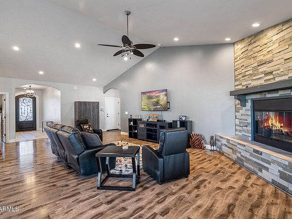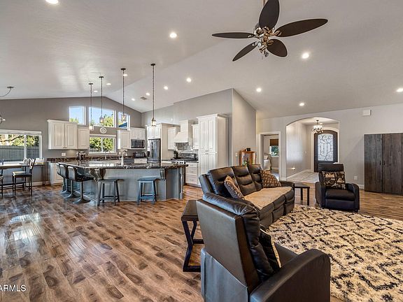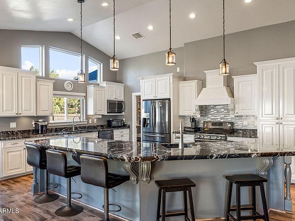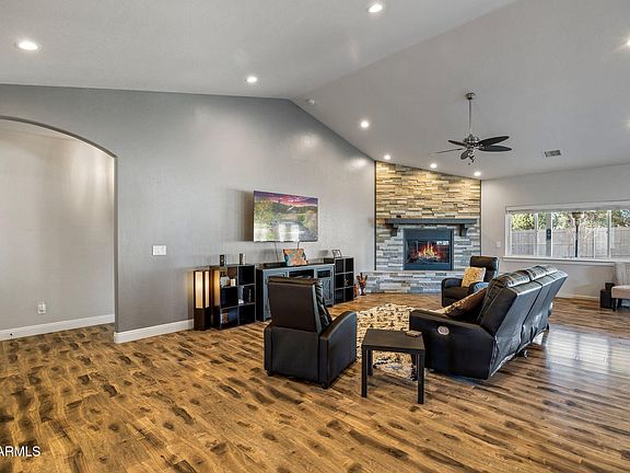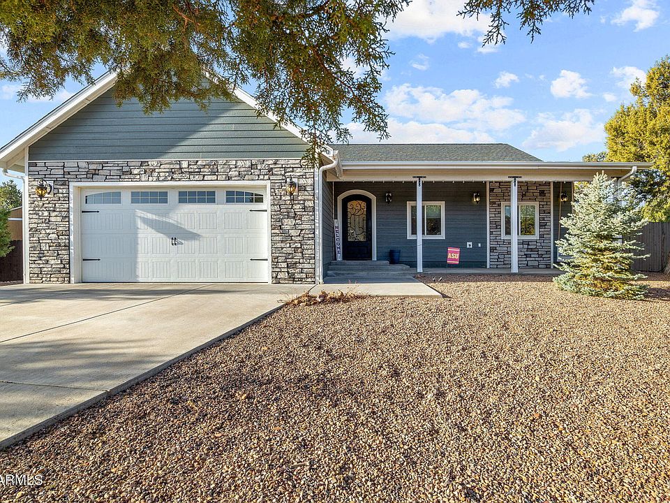 Welcome to this stunning 4-bedroom, 2-bath home that combines elegance & comfort, in the heart of Show Low with no HOA. From the inviting front entry with its charming custom accents & stunning front door, to the light-filled vaulted ceilings & flowing floors, every detail has been designed to impress. The open floorplan features a great room with a striking stone fireplace, perfect for cozy evenings. Flowing into a chef's dream Kitchen, boasting with a massive island, abundant counter space, & ample storage; as well as, a large pantry & a convenient laundry area ensure functionality without compromising style. The primary suite is a luxurious retreat with a custom ensuite that includes a spacious closet, a double-sink vanity, a relaxing soaker tub, & an oversized walk-in shower. Guests will feel at home in the generously-sized additional bedrooms and well-appointed bathroom. Outside, the expansive lot is designed for low-maintenance living, while the extra-large covered back patio, complete with ceiling fans, creates the perfect space to savor warm summer nights.