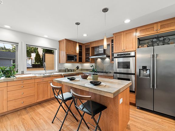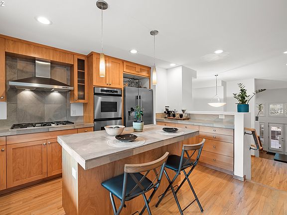 Beautiful, centrally-located row home near many restaurants, walkscore of 93! High ceilings, open floorplan, lots of natural light from large windows & skylights. Hardwoods, gas fireplace. Beautiful kitchen w/loads of cabinets, large island, pantry, gas range, stainless appliances. Spacious, private, partially covered deck with storage closet. Custom bathrooms, one with large tiled walk-in shower. Large 2 car garage, plantation shutters, A/C. Lots of storage! Lower level storage or workout room [Home Energy Score = 7. HES Report at https://rpt.greenbuildingregistry.com/hes/OR10004557]