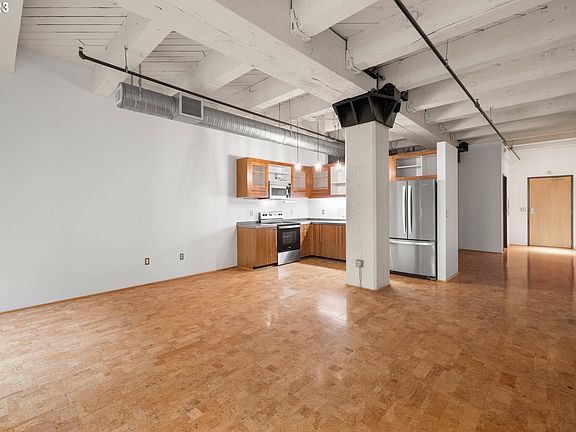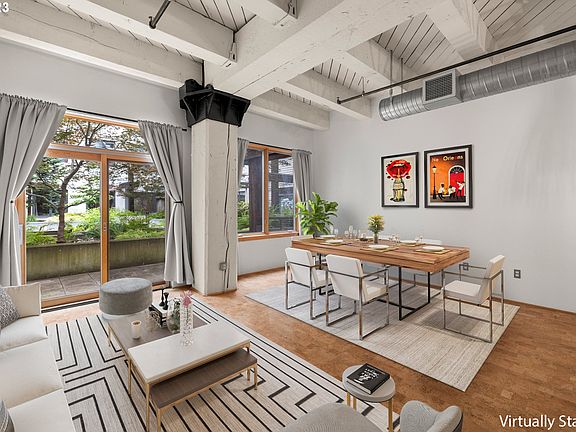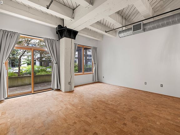 Stunning Industrial Warehouse-Style Loft with Spacious Private Patio! This upgraded and well-organized space features super high ceilings, making it feel much bigger than the square footage, exposed old-growth fir posts and beams and steel brackets, cork floors, newer stainless steel appliances, fabulous custom closet in bedroom area and in-unit laundry. Add to that a 141sf concrete patio facing a serene and beautifully-planted interior open-air courtyard for grilling, entertaining and relaxing! Deeded parking space with adjacent deeded storage space in secure garage. Building is well-managed, pet friendly, quiet and safe. 1 block to streetcar stop. Only blocks to grocery shopping, top notch restaurants, freeways, bus lines, bars and other services. Classic Pearl District Living!