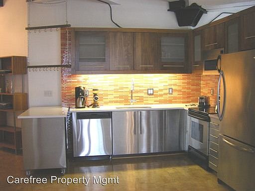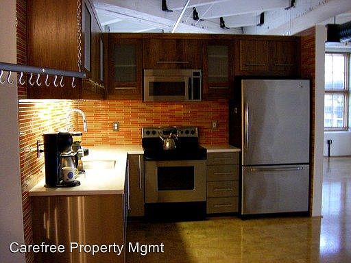 PEARL DIST. 2 BEDROOM! Marshall Wells Lofts 4th floor corner unit! Almost 1500 square feet! Custom designer shelving unit in entry. A dozen windows light up the whole space! Huge beamed ceilings. Nice kitchen with glass tile backsplash and island on wheels! Stainless appliances and stainless drawer fronts. Hanging pot rack! Large storage closet off entry with metal shelves. Creative use of designer "draperies" isolates sleeping spaces. Beautiful gleaming cork floors! Indoor assigned parking space. Large storage space with 2 windows! Please call Carefree Property Management, Inc. to schedule an appointment. 503-297-8111. www.carefreeinc.com (RLNE2002412)