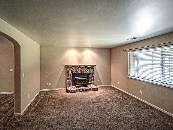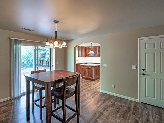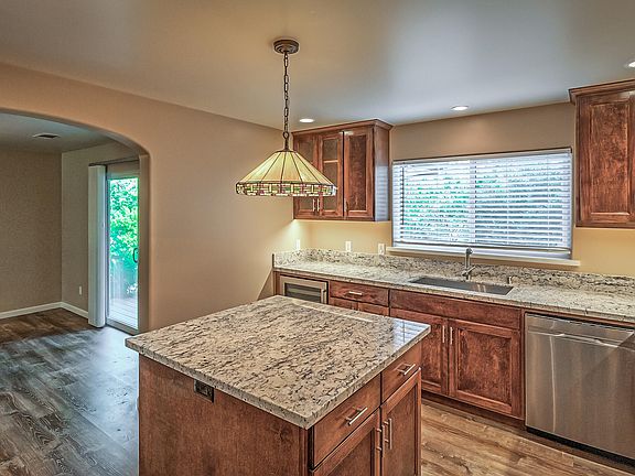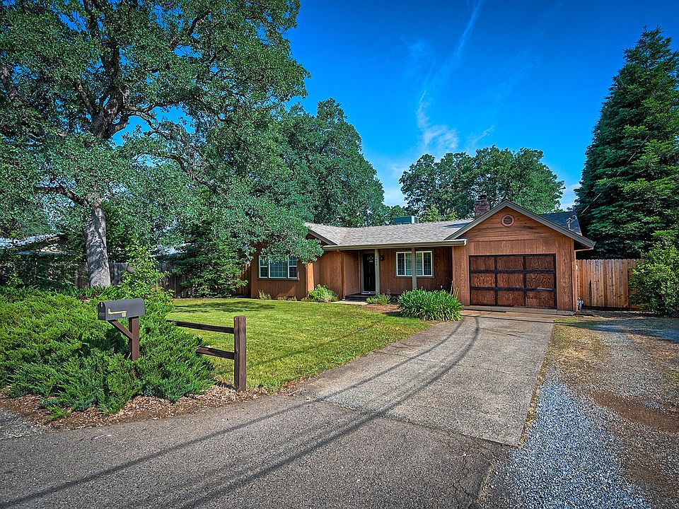 cabinets, granite countertops, island and stainless steel appliances. Roof only 1 year old and fireplace with woodstove insert. Newer flooring and inviting covered deck. Raised garden beds and redwood trees lining the east side of the rear