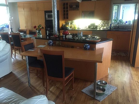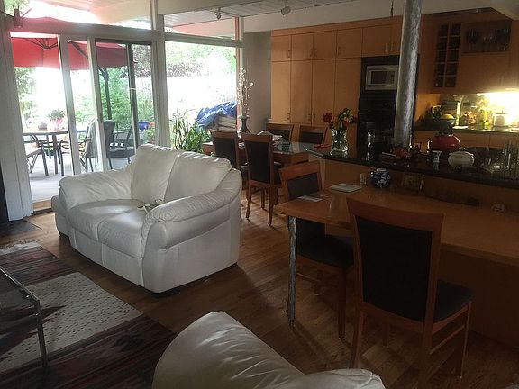 A California-style ranch with loads of light from the multiple skylights and extra large added windows. Contemporary open floorplan with granite-topped island in the great room that combines the kitchen, a breakfast area and living room. Formal dining room looking out on a patio. Two fireplaces. Beautiful landscaping with sizable back yard and fenced area with dog house.