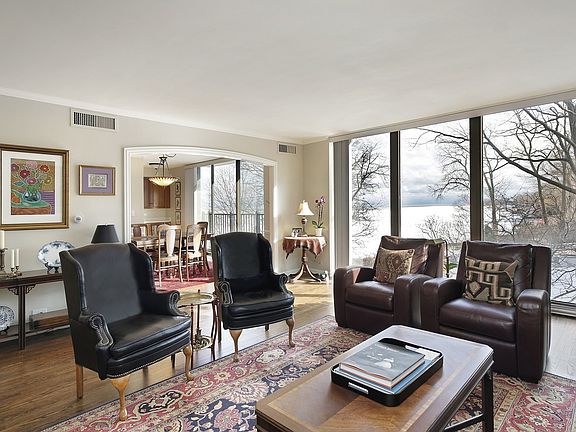 Lakefront living in Wilmette's first-class condo building. Apartment 4A combines a thoughtful high-end renovation with spectacular lake views through floor to ceiling windows along with unparalleled building amenities. This exceptional layout, with hardwood floors and an open floorplan, includes significant living space with a traditional living room, classic dining room with custom cabinetry and a top-of-the-line cook's kitchen with high-end stainless appliances. The luxe master suite with a walk-in shower has generous closets and a wall of windows. The second bedroom suite includes a marble and white bathroom and loads of closets. New in-unit laundry and timeless powder room. New heating and air conditioner blower unit, programmable thermostats, electric panel and breakers. Stress-free living with a 24-hour doorman, two on-site managers, valet with weekly car wash, exercise room, and an outdoor pool! Easy to show. Special note: The building in collaboration with shoreline engineers undertook a project to ensure the integrity of the structure."