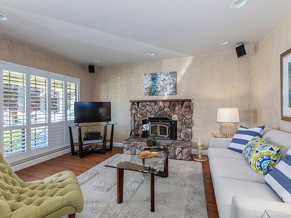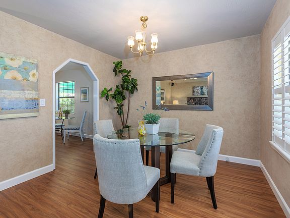 Charming 1,050 sqft home 3B/1B, w/ formal dining room, eat-in kitchen, new roof & on a 6,450 sqft lot. It's the perfect package! A new front door inviting you in. Large custom windows w/ high end plantation shutters. Beautiful newly installed floating vinyl floors all throughout the main living area. Surround sound speakers & wood burning stove insert encased by a stone hearth & traditional mantle. The family room flows nicely into the formal dining room w/ a classical chandelier. Spacious eat-in kitchen w/ original wood cabinets, brand new ivory counter top & new hardware, freshly painted upper & lower cabinets, and stainless convection range. Updated bathroom w/ pedestal sink, solid surround standing tub & shower, modern window & custom cabinets for storage. All three comfortable & carpeted bedrooms have large windows, & generous closet space w/ classic original solid wood doors & hardware. The backyard is an enormous blank canvas w/ an abundance of potential. Open Sun 2-4