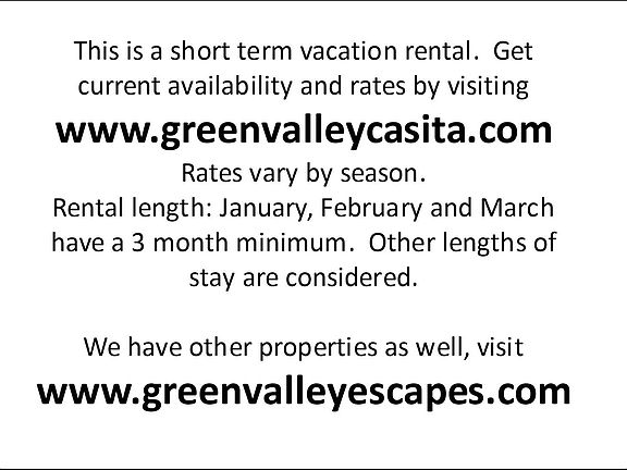Available January, February and March 2021. One Month Minimum. This short term vacation rental has a view of the Desert Hills Golf Course with the Santa Rita Mountains as a backdrop. This comfortable unit is fully-furnished with everything you will need for your stay in Green Valley. Rates and availability vary by season; please check our website for more information. Rates and availability vary by season. A deposit is due at time of booking to confirm a reservation. The balance is due 30 days prior to arrival. All payments are non-refundable.
