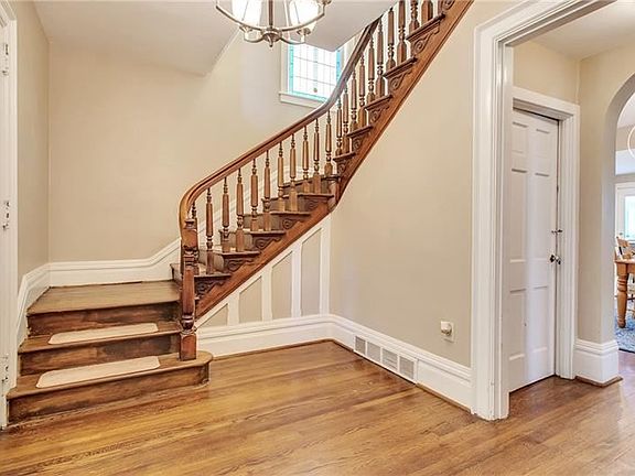 Situated on one of the most sought after streets in the borough of Edgewood and overlooking the School for the Deaf, this gorgeous Victorian blends city-living with country farmhouse charm. Upon entrance, you are greeted by a stunning curved staircase with stained glass window and sight lines into the large, updated kitchen and dining room. The spacious living area is highlighted by high ceilings, decorative fireplaces, crown moulding, dark hardwood flooring, and a library/office space with built-in shelving. The second floor boasts three bedrooms, a full hallway bathroom, laundry room, and master bedroom with en-suite and walk-in closet that opens to a quaint private terrace. The expansive third floor offers flexibility with four additional rooms and full bath. Relax in the level, fenced in rear yard--perfect for family gatherings and taking in the summer sun! To top it all off there is a single detached garage and driveway for additional parking and newly rebuilt front porch.