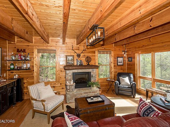 Pristine Condition- Every surface has been refinished and upgraded. A total make over! Set perfectly in the trees, this is a woodland paradise, with National Park Mountain Views. Close in and convenient, located at the top and back of small desirable resort, Cedar Creek Crossing on .71 of an acre which is just minutes from downtown Pigeon Forge. Master is conveniently located on the main level, another up with its own bath as well and the third bedroom is an open loft high in the rafters. The quality of the log timbers, open beams, walls of glass on every side is spectacular- you will never want to leave. None of the new construction can compete with this high end true log construction! You will love the open floor plan, the large recreation room with second gathering area. The new refreshed mountain modern decor shows off the timeless features of at the open stairwell, the gleaming hardwoods and hemlock. Light pours in through the windows all day to make this an airy treehouse! Beautiful resurfaced circular driveway is surrounded by rock outcropping dry bed natural landscaping. A fire pit, outdoor grilling and large front covered porch make this a cabin that allows you to enjoy the natural Smoky Mountain setting. Comes totally outfitted and ready to enjoy, fully stocked kitchen, hot tub, game table, TV's and beautiful high end bed coverings! In perfect condition, you will not be disappointed! Cabin has not been rented in the last years and since the remodel.