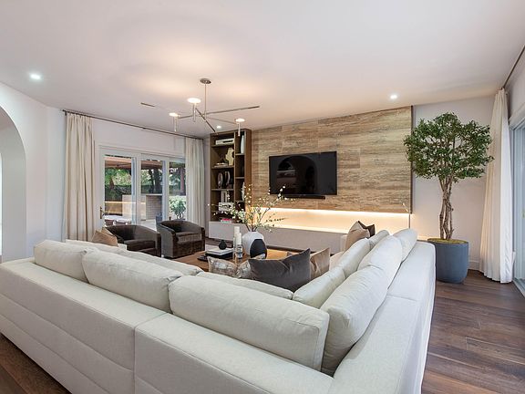 Welcome to this stunning, fully furnished home in the coveted Equestrian Club Estates, expertly designed by Soco Interiors. This beautifully renovated, courtyard-style residence boasts 3 spacious bedrooms and 3 full bathrooms, all thoughtfully crafted with high-end finishes. Enjoy serene water views from the main living area, creating a tranquil atmosphere that perfectly complements the organic contemporary design. White oak wood flooring flows throughout, adding warmth and elegance to the modern aesthetic. Experience refined, relaxed living in this exquisite home, where every detail has been meticulously curated for comfort and style.