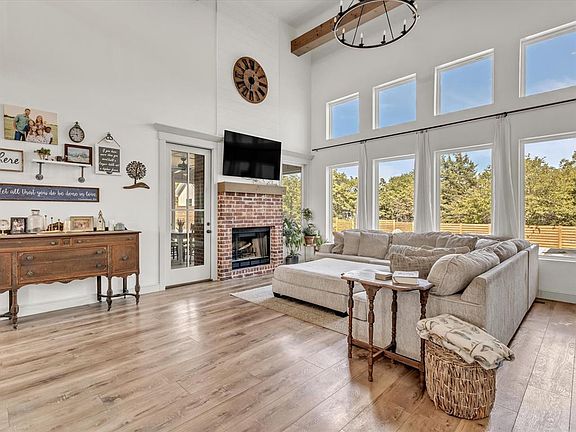 Modern farmhouse perfection on 1.25 acres in a gated community where shops are allowed with HOA approval! This 5 bed, 3.5 bath home is full of custom details and thoughtful design. The open-concept kitchen stuns with white and gold appliances, a built-in fridge (included), and a large island crafted from a reclaimed boxcar floor. Soaring ceilings with wood beams and a wood-burning fireplace create a cozy yet grand living space.The primary suite is located on the main floor and includes a secluded bonus area perfect for an office, movie room, or man cave. The oversized closet connects to a laundry area with hookups for 2 washers and 2 dryers. Two additional bedrooms downstairs share a full bath, and there's a unique half bath off the screened-in porch—complete with a foot washing station that could double as a dog wash. Upstairs offers a loft/bonus space, 2 more bedrooms, and a full bath—one bedroom is large enough to serve as a game or media room. Luxury vinyl floors throughout, custom built-ins, and beautiful finishes make this home a standout. Enjoy a spacious screened-in porch overlooking the backyard, saltwater pool with waterfalls and tanning ledge, and a peaceful wooded backdrop. A small outbuilding stores pool and lawn equipment, and behind the fence, chickens roam freely. The property extends all the way back to Anderson Rd. Come experience this one-of-a-kind retreat!