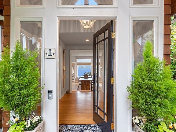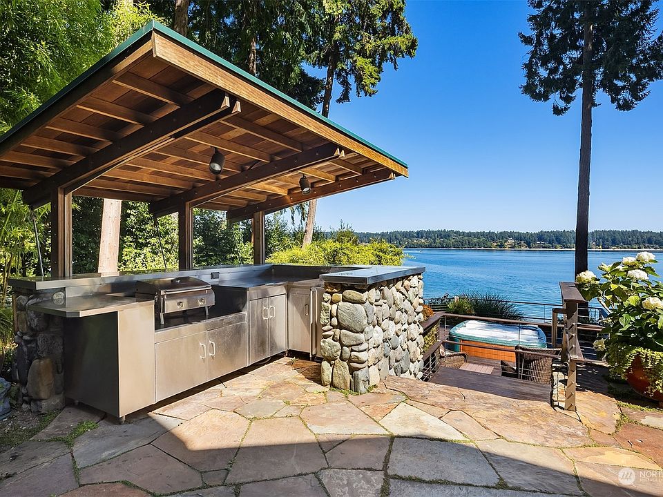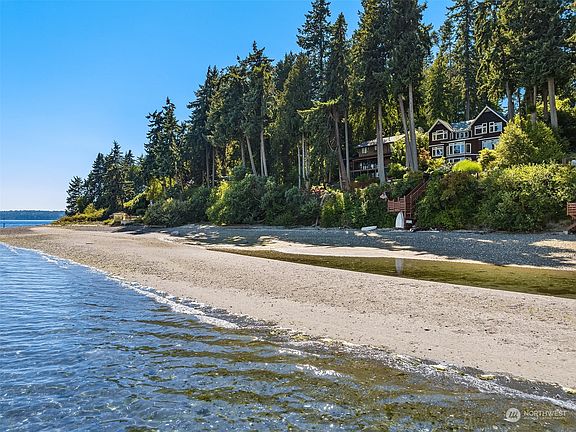 Improved price for this stunning waterfront retreat! Perfectly sited on 95 ft of Puget Sound waterfront - and just minutes from Bainbridge & downtown Poulsbo. Profiled in West Sound Home & Garden for it's gorgeous gardens, custom architectural details & coastal interior design. Marvel at the abundant light & stunning views in this immaculately maintained home. Enjoy the expansive dining room, beautifully designed for entertaining. Prepare meals in style in the remodeled chef’s kitchen w/ custom breakfast bar & butcher block island. Primary suite w/ ensuite bath, two bedrooms plus den are all upstairs. Additional apartment/suite:boasting over 900 square ft, includes kitchenette, cedar sauna, & sleeping loft. Waterfront living at it's finest!