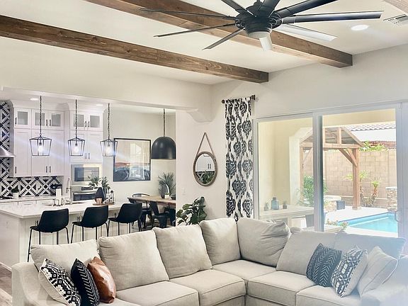 This Signature plan 3 features stylish laminate plank wood flooring throughout the main living areas and upgraded carpet/tile at bedrooms and baths. Fabulous kitchen featuring upgraded white cabinets, brushed nickel hardware, quartz countertops, large island, stainless steel appliance package including a gas cooktop, wall oven, and hood/vent. This floorplan has been professionally decorated.. Beautiful community and Private swimming pool , spa, exercise room, and outdoor BBQ/gathering area. Model perfect and a must see.