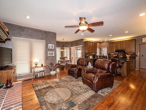 You will love coming home to this beautifully landscaped 1 1/2 story with gorgeous water views and complete with a lovely living room that welcomes each guest and features a two story high ceiling, chandelier, large window, and two-way gas fireplace, formal and informal dining areas, granite kitchen with island with island, breakfast bar, over and under cabinet lighting, built-in desk, recessed lighting, ceiling fan, and pantry with pull-out shelving, and open to the hearth area with two-way fireplace with brick surround, ceiling fan, built-in speakers, recessed lighting, and large window. The laundry room is conveniently located right off the kitchen and includes tile flooring, an abundance of cabinet space, counter, sink, and hanging rod. You will love waking up in the morning in this luxurious master suite with an amazing view of the water. This sensational room also features large windows, carpeting, trayed ceiling with ceiling fan, built-in speakers, and private bathroom with granite counter tops, whirlpool corner tub, double vanities, separate shower, built-in cabinet, ceiling fan, built-in speakers, and his and her walk-in closets! The loft area is the perfect space to sit back and read your favorite book and features a skylight and window with window seat and storage. This second level features two spacious additional bedrooms with their own bathrooms. Entertain with ease in this fabulous finished basement complete with family room with fireplace, built-ins, viewout windows, decorative ledge, built-in speakers, enough room for your favorite game table, and wet bar with dishwasher, microwave nook, and a place for a full size refrigerator. Sit back and relax on this gorgeous deck with remote control operated pergola while looking out at the backyard.