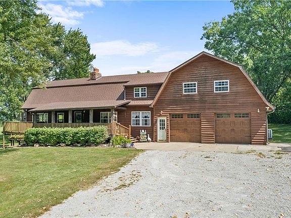 Escape to your own slice of paradise just outside the city limits of Kearney, MO. This beautiful 4-bedroom home is the perfect blend of rustic charm and modern comfort, nestled on a picturesque 4.7-acre park-like setting with woods and a pond within the highly sought-after Homestead Hills subdivision. Meticulously cared for by its owners, this residence offers over 2,400 sq. ft. of living area and radiates pride of ownership. With a warm log-cabin style interior and inviting atmosphere, the home graciously accommodates 4 bedrooms, 1 full bath, 2 half baths, living room, dining room, breakfast nook, oversized 2-car garage & workshop, large wrap-around porch, expansive outdoor spaces with a pond, outbuilding and more!