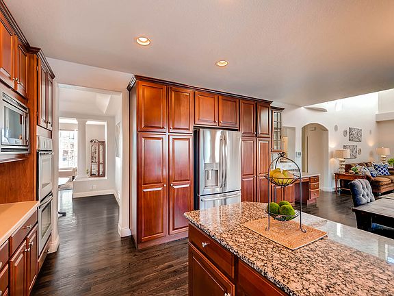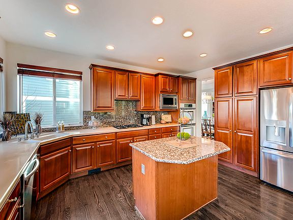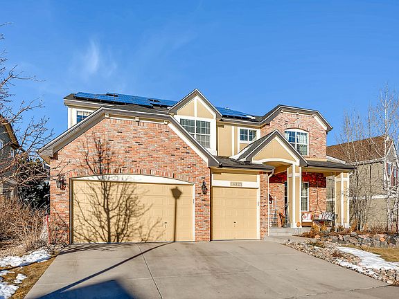 Amazing Village of Five Parks two story home with professionally finished basement. Lots of room to spread out and entertain. Gorgeous gourmet kitchen with built in desk, cherry cabinets, slab granite, gas cooktop and newer stainless appliances...Beautiful walnut stained hardwood floors thoughout the main floor...lots of updating throughout...Four spacious bedrooms on upper level PLUS a large loft make this ideal for many purposes...The finished basement offers a large great room with two sided fireplace (one side in bedroom and the other in the rec room), a wet bar and kitchen area crafted with dry stacked stone, granite counter tops and stainless appliances...Built in storage in great room...Fun modern lighting throughout. Private backyard with large stamped concrete patio and built in firepit...Walk to community pool and clubhouse with fitness facility and top ranked schools...Additional features include solar panels, pergola and newer roof