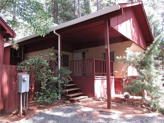 Darling coach with large detached garage on lovely wooded lot in the Pines. This home has 2 bedrooms, living room plus den with gas stove, new carpet, newer septic, lots of built-in drawers/cabinets/storage. Mirror closet doors, ceiling fans, large deck. Garage has bathroom with shower and large workroom for crafts, hobbies, for all kinds of projects. Come tour the inside. Has been a nice cash flow rental. Must see.
