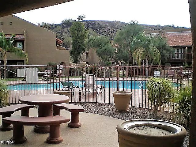 FULLY FURNISHED- One bedroom condo in North phoenix. Hardwood and travetine flooring throughout (NO CARPETING). 2nd floor (no one above you) vaulted ceilings, Large veranda overlooking Moon Mtn (hiking right outside your door), with saltillo flooring, french doors. Stainless steel appliances, lots of closets, storage space. HEATED POOL, Jacuzzi, Clubhouse with workout room, billards room.