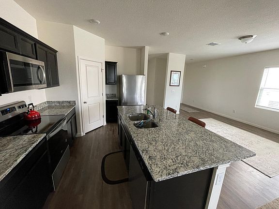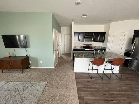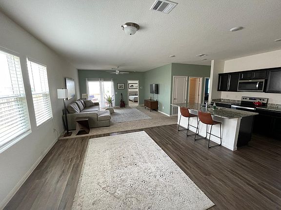 Built in 2021, this new home features a spacious great room and master bedroom, as well as raised patio in the back, fenced-in yard, and a great wilderness view. The modern kitchen with stainless steel appliances, black cabinetry and large island with quartz countertops is ideal for prepping day-to-day meals, as well as entertaining guests. The house has three bedrooms, two bathrooms, a two car garage, a utility room and one great room which consists of the living room, dining room, and kitchen all sharing one space. The Master bedroom is spacious and can easily host two dressers and still have space for a reading chair or small office area. A master bath and large spacious walk-in closet complete the master suite. Very nice community pool access included. No smoking. No cats. Must follow and abide by HOA membership rules. $400 non-refundable pet fee per pet. A minimum of a 12 month lease is required. Tenant is responsible to provide own washer and dryer. Yard upkeep is the responsibility of the tenant and is expected to follow HOA guidance.