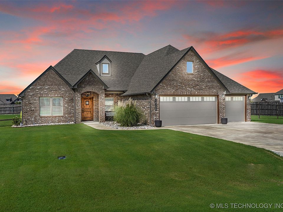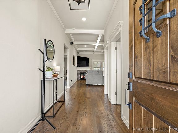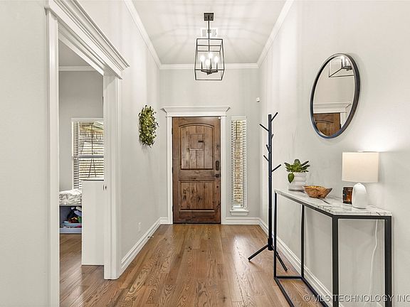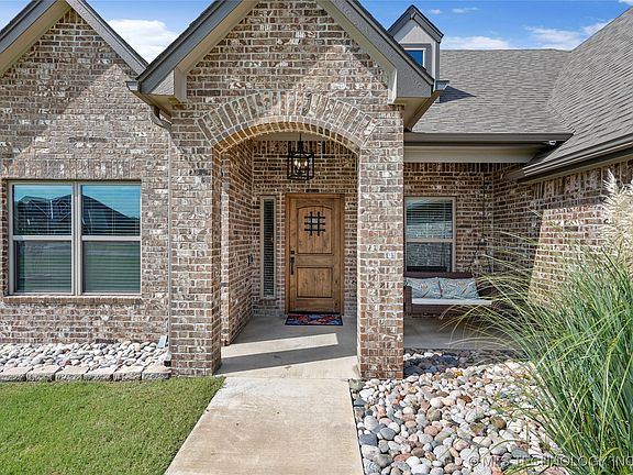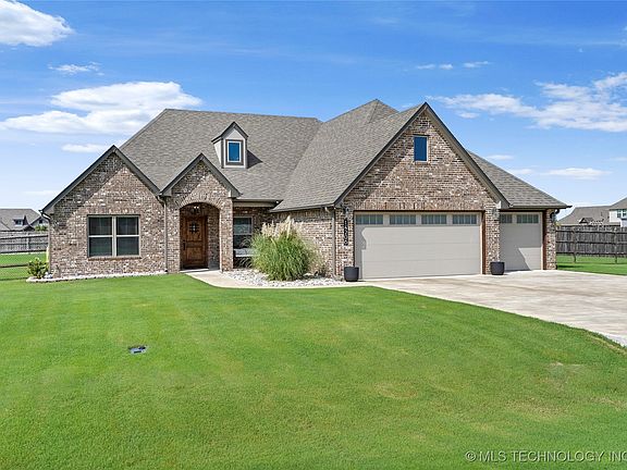Like new & move-in ready, this stunning show home by Strategic Homes sits on a spacious half-acre lot in the desirable 4-Bar Ranch addition. Step inside and you’ll immediately notice the quality craftsmanship—extensive woodwork, crown molding, Renaissance hardwood floors, and gorgeous wood beams. The spacious gourmet kitchen is the heart of the home, featuring custom cabinetry, granite surfaces, stainless steel appliances—including a Frigidaire Professional Column Set refrigerator—and a large island that opens seamlessly to the living area. The dining space is perfectly positioned for family meals or entertaining, while the living room’s corner fireplace and wall of windows bring in natural light and frame backyard views. The primary suite feels like a private retreat with its spa-like bath, oversized shower, and elegant finishes. Need space for work or hobbies? Your choice of 3 additional bedrooms, providing flexibility for your lifestyle. Outdoors, enjoy evenings on the private patio, fire up the grill for BBQs, or take advantage of the oversized lot with room to add a pool, a play area, or simply soak in the spectacular Oklahoma sunsets. Car enthusiasts and hobbyists will love the 3-car garage, complete with a mini-split system for year-round comfort—ideal for a home gym, workshop, or extra storage. Located in Collinsville Schools with quick access to Hwy 75, this home offers the perfect balance of small-town charm and easy commutes to Owasso, Tulsa or Bartlesville.