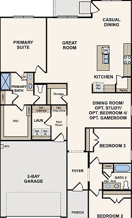 Designed with your comfort and convenience in mind, the single-story Davis plan at Caney Mills offers the perfect combination of living and private space. Anchored by an inviting open-concept living area, this home features a spacious great room that flows into a well-appointed kitchen-boasting a center island and walk-in corner pantry-which overlooks a casual dining area with access to an optional covered patio. Toward the front of the home, two generous secondary bathrooms flank a full bath. On the other side of the home, a secluded primary suite includes a private bath and roomy walk-in closet. Additional main-floor highlights include a laundry room, a valet entrance with an optional built-in bench and storage, and a formal dining room-also available as an extra bedroom, game room or study.