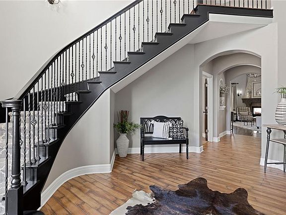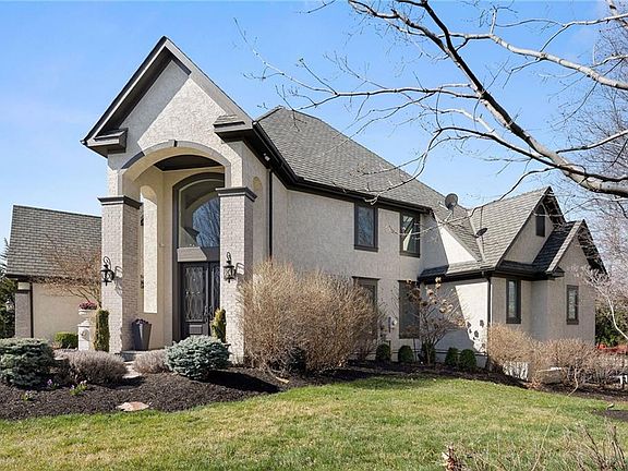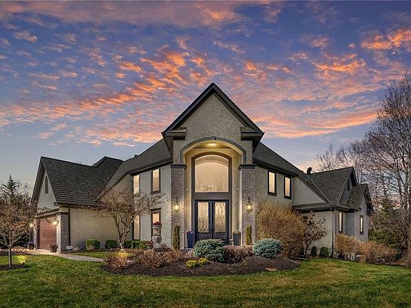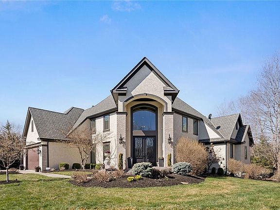matter your sport, the game size sport court for basketball, volleyball, pickleball and soccer will provide hours of enjoyment. Step inside and your first view from the 2 story foyer with sweeping curved staircase is into the vaulted ceiling great room with corner see-through fireplace. Great room is open to the updated kitchen with deep walk-in pantry and eat-in breakfast area. Main level office plus an additional flex room on the main level which could be a formal living room, dining room, additional office or even bedroom. The spacious owner's suite includes double doors onto the covered patio and a gorgeous updated bath w/soaking tub, rain head shower and radiant floor heating. Fun and flexible lower level with recreation/media room, workout room, full bath, and bar/gaming area. Sought-after neighborhood with close proximity to award-winning Blue Valley schools - Harmony elementary and middle.