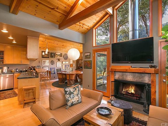 Forest views! Skylights and pocket doors! The soaring windows of this home look out from the great room into a mountain valley. Solid maple floors and a vaulted pine ceiling accentuate the light, bright space. Step out to the deck to watch the jays, smell the pines, and enjoy a drink or a meal. The dining area has picture windows and accommodates a large table. The open kitchen has maple cabinetry, granite counters, and two sinks, with stainless steel appliances and a breakfast bar. This large architectural home has 4 bedrooms and 2 full baths plus a 3/4 bath and an additional room as described below which can be used as a bedroom, in a multi-level floor plan that provides privacy or togetherness by the hearth for family members and friends. One room, usable as a family room, office, or bedroom, opens onto the expansive rear deck with overhead fan and waterproof decking, and an attached bath, built-in cabinets and a closet. The master suite has a jetted corner tub with a view, and there's a shower in the master bath. The stacked Speed Queen commercial washer and dryer are located near the master. Serving the home is a Generac generator, a water softener, and an attached, roomy, one-car garage. This is your opportunity to own one of the most beautiful homes in Pine Mountain Club, sited on one of the most desirable streets.