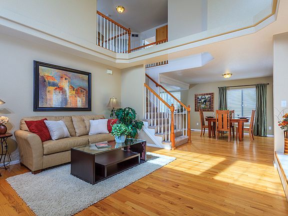 Wonderful two story home in The Villages! Prime location close to great schools, dining and shopping. The welcoming family room encompasses soaring two-story ceilings, hardwood floors and a gas fireplace. Dining room provides an excellent space for entertaining with hardwood floors and exterior patio access. All appliances are included in the open kitchen with a trey ceiling, panty, and breakfast bar. Convenient main floor half bathroom as well as a laundry room that includes both washer and dryer. Spacious master bedroom with a walk in closet is the ideal retreat. Four-piece master bathroom features tile floor and a convenient linen closet. Two additional guest bedrooms share the full hallway bathroom with new tile floor. Opportunity for expansion in the unfinished basement. Highly desirable area in Highlands Ranch with a neighborhood pool. Hurry!