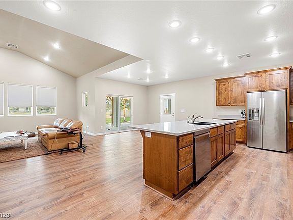 Stunning custom-built home on the fairway at Lake View Executive Golf Course. NO HOA! This gorgeous 3 bed 2 bath home sits on just over a half-acre fenced. Appx 720 sf garage with a deep extension on one side for 3rd car, plus detached garage appx 200 sf as well as ample room behind the RV gate for appx. 40' RV with hookups. Landscaped yard includes horseshoe pit area. Back patio is perfectly situated to enjoy the sunrise over the fairway, or for evening BBQs & yard sports by the firepit. Fenced back yard has a golf cart gate to allow access to the course. Inside is a large open floor plan, high ceilings, & tons of natural light. Kitchen boasts stainless steel appliances, oven and dishwasher never used. Appx. 10 ft long island with farm style sink, large enough to seat appx 8 people. Carpeted upstairs climate-controlled loft, possible 4th bedroom. Huge walk-in closet in primary bdr, dual vanities. This home has more amenities than I have room to list. Come see it before it's gone.