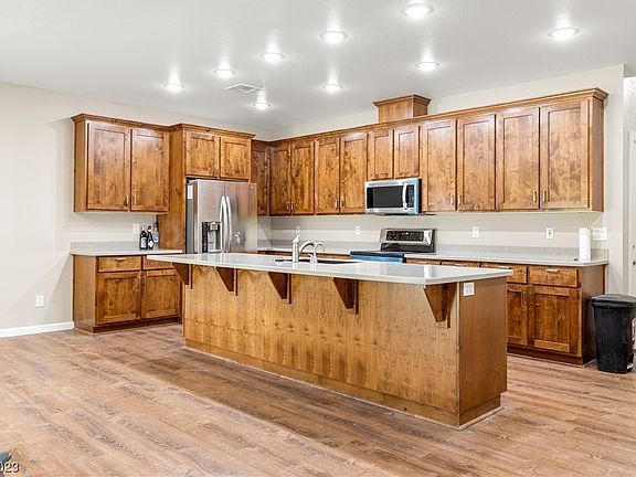 - Description: Breakfast Bar/Counter,Custom Cabinets,Island,Lighting Recessed,Man Made Woodor Laminate Flooring,Quartz Countertops,Stainless Steel Appliances